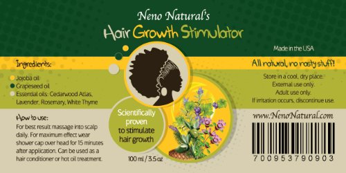 Neno Natural's Hair Growth Stimulator has been carefully formulated to nourish your hair and stimulate your roots to grow. Ingredients scientifically proven to promote hair growth; Increases you scalp's health; Non-greasy oil; Will help reduce dandruff and keep pores unblocked; No artificial colors or fragrances; Size: 100 ml glass bottle. Keep in mind that good hair management practices also influence how much length you retain. To reduce breakage keep hair well moisturized and manage it with love and care! :)Feature