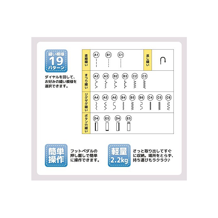 본체 중량2kg와 콤팩트 바디면서 무려 19패턴의 박음질 모양을 선택할 수 있습니다.