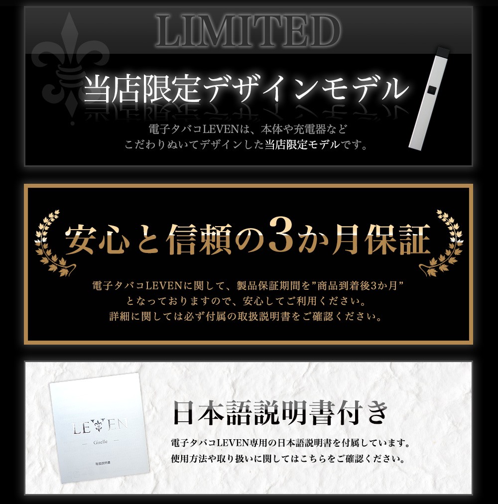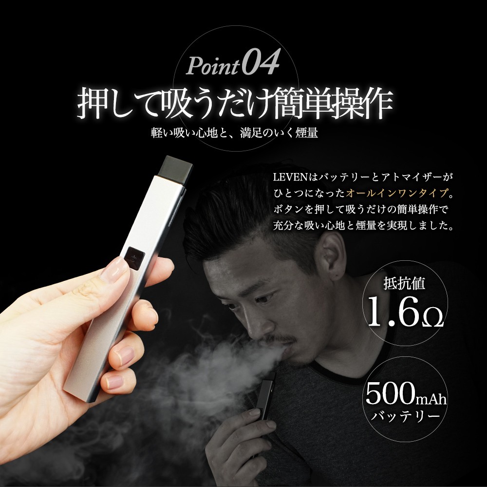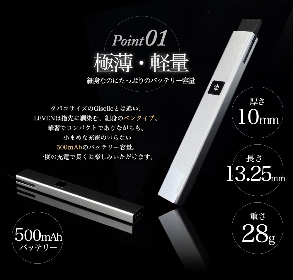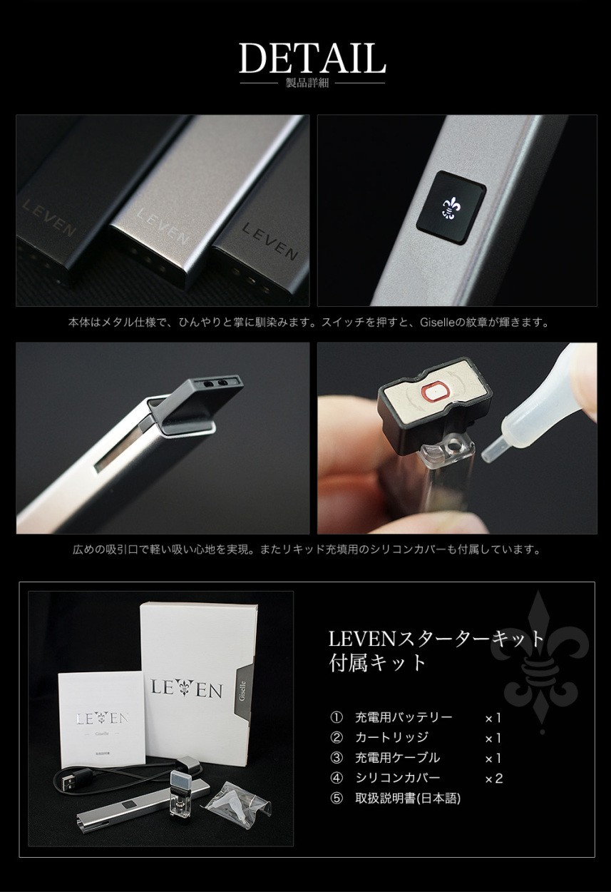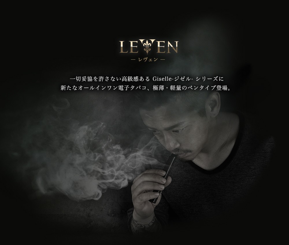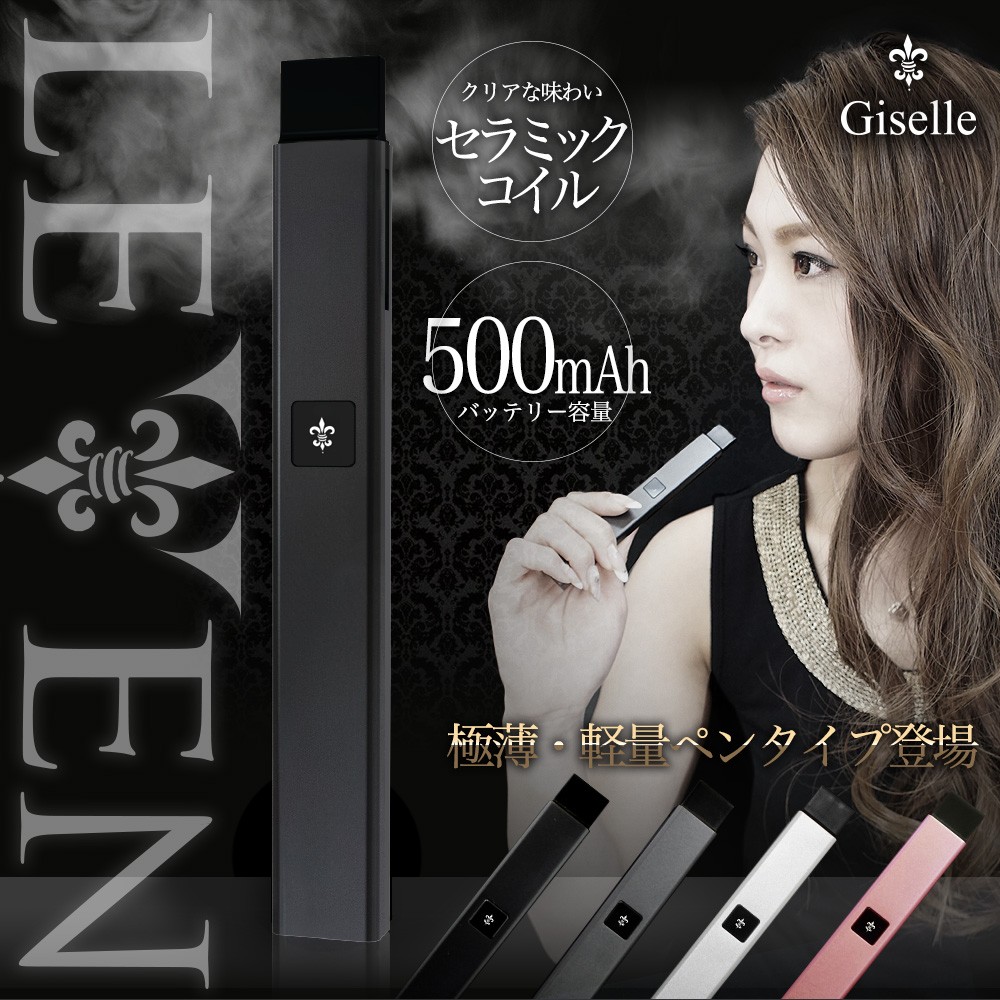 ・一切妥協を許さない高級感のあるGiselle(ジゼル)シリーズに、 新たなオールインワン電子タバコ、極薄・軽量のペンタイプLEVEN(レヴェン)登場。 ・タバコサイズのGiselleと違い、指先に馴染む細身のペンタイプ。 小まめな充電がいらないたっぷり500mAhのバッテリー容量があります。 ・雑味が少なくクリアな味わいが楽しめるセラミックコイル採用。 ・マグネット式カートリッジで簡単装着。釣鐘方式なので使用中にリキッドが外に漏れてしまう心配はありません。 ・スイッチを押して吸うだけ、軽い吸い心地と満足のいく煙量を実現しました。 ・リキッドの充填に便利な細身のシリコンカバー2本付き。 |