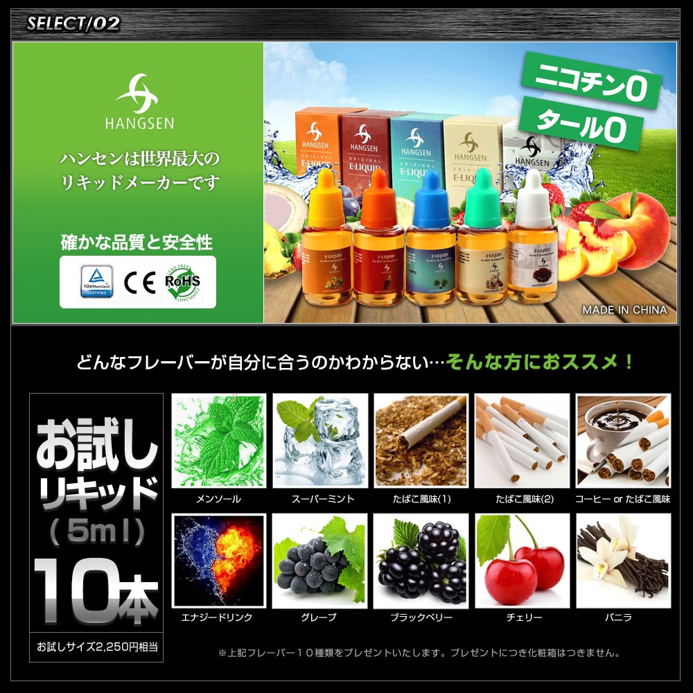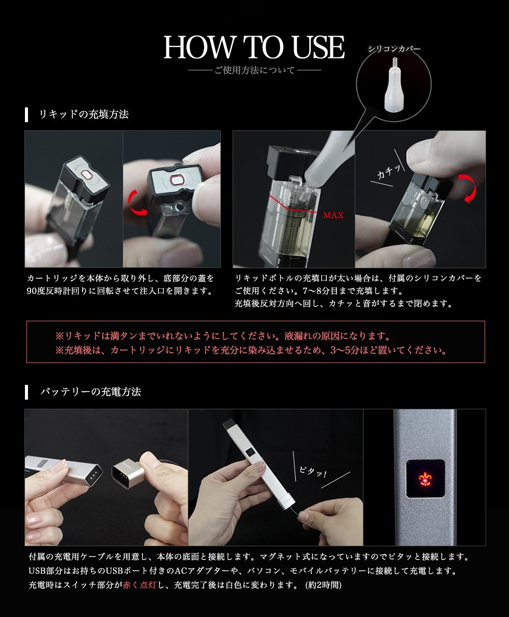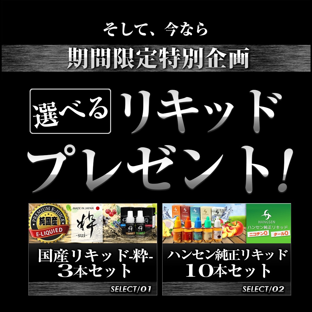 充電用バッテリー×1、カートリッジ×1、充電用ケーブル×1、リキッド充填用シリコンカバー×2、 取扱い説明書(日本語) |
