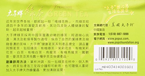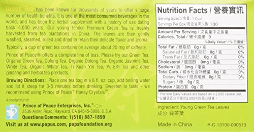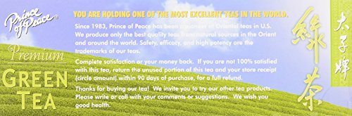 -. Binding : Misc. -. Brand : Prince Of Peace -. EAN : 0039278131000 -. Feature : The leaves are then gently washed steamed rolled and dried to retain their delicate flavor and aroma. -. Label : PRINCE OF PEACE -. LegalDisclaimer : Must be at least 18 & over to purchase -. Manufacturer : PRINCE OF PEACE -. MPN : 039278131000 -. PackageQuantity : 2 -. PartNumber : 039278131000 -. ProductGroup : Grocery -. ProductTypeName : GROCERY -. Publisher : PRINCE OF PEACE -. Studio : PRINCE OF PEACE -. Title : Prince of Peace Premium Green Tea 100 tea bags (Pack of 2) -. UPC : 039278131000