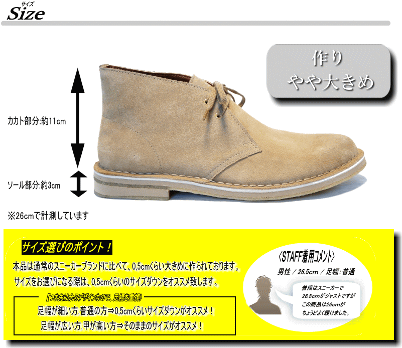 | 商品説明 | <ITEM INFO> ・天然皮革、本革レザー(本革スウェード)仕様のチャッカブーツ。 ・本革なので、履くほどに味が出るカジュアルシューズです。 ・ソールには衝撃吸収しやすくグリップ力のあるラバー素材のアウトソールを使用。 ・シンプルなデザインで、オールシーズン履けて、様々なコーディネイトに活躍してくれそうです! ・合わせやすいベーシックなカラーも嬉しいポイント。 ・流行に左右されないシンプルなデザインとカラーなので、幅広い世代の方にオススメです! ▼GOLDEN RETRIEVER製品について ▼- 必ずお読み下さい - こちらの製品は、いわゆるブランド品や、アメリカ製などの高単価のレザーシューズでは御座いません。ブランド志向が強く、細部のクオリティーまでこだわる方には、あまりオススメ致しません。当店と致しましては、天然皮革(本革)を使用し、大変リーズナブルな商品と位置付けおりますが、以上の点をご理解、ご了承の上、お買い求め下さいませ。 |