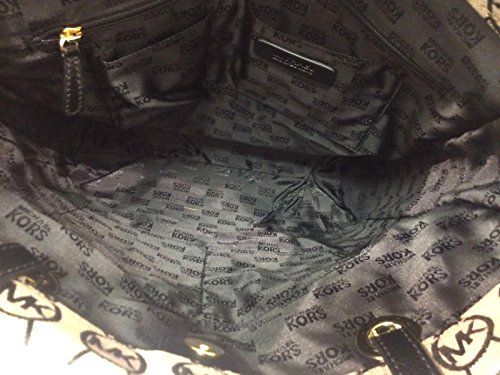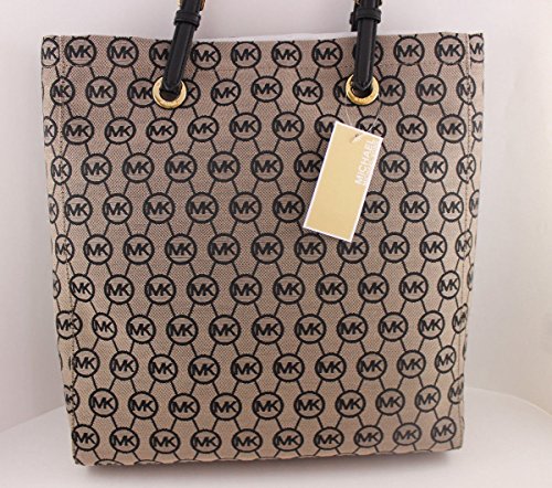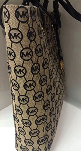 Wrapped in Michael Kors monogram block print on beige and black jacquard fabric. It is trimmed in black leather with golden hardware. The interior is lined in Michael Kors logo print fabric and features a zippered pocket and (4) open slip pockets. The open top has a magnetic closure. Dual handles have a drop of 8.5 inches. It is accented with a removable hanging circular Michael Kors logo charm. The overall measurements are approximately 13.5 inches (L) x 14 inches (H) x 3.5 inches (W).Feature