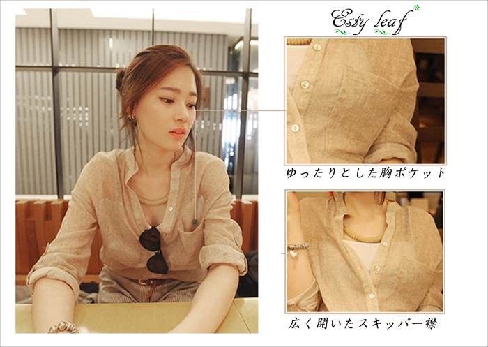 ・ポリエステル混のサラッとした薄手素材を使用した、Vネックスキッパーシャツブラウス。・長袖にしても薄手のさらっとした素材なので、紫外線対策、冷房対策としてもオススメです♪・襟回りはボタンが無くスッキパーシャツとして着て頂く仕様になっており、着崩したお洒落な印象を与えます。●サイズ展開 【M】着丈72cm バスト108cm 肩幅56cm 袖丈45cm 【L】着丈73cm バスト112cm 肩幅57cm 袖丈46cm※平均での採寸となりますので、多少の誤差が生じる場合がございます。ご了承くださいませ。●カラー展開 ホワイト グレー ベージュ グリーン ネイビー●商品詳細 【素材】:コットン・ポリエステル 【透け感】:あり 【厚み】:薄め【裏地】:なし 【シルエット】:ゆったり 【伸縮性】:なし【付属品】:なし (コーディネート使用の衣類、アクセサリー等は付属しません)20代 30代 40代 50代 人気 レディースファッション 大きいサイズ