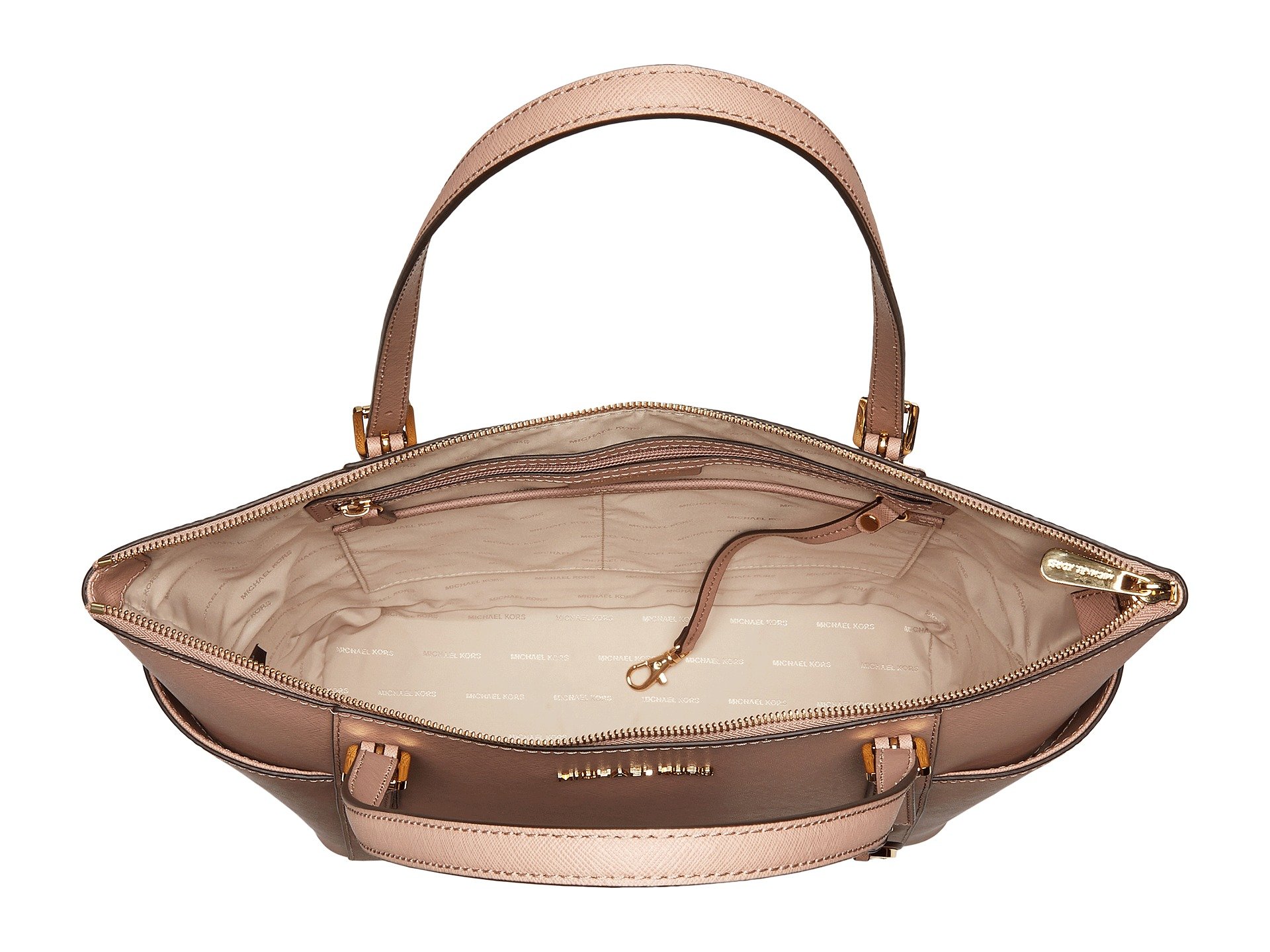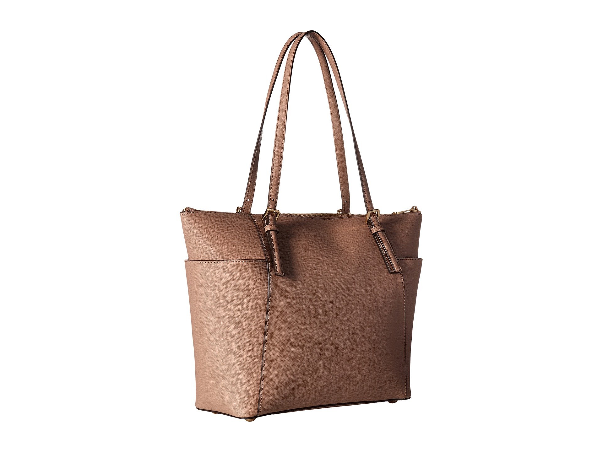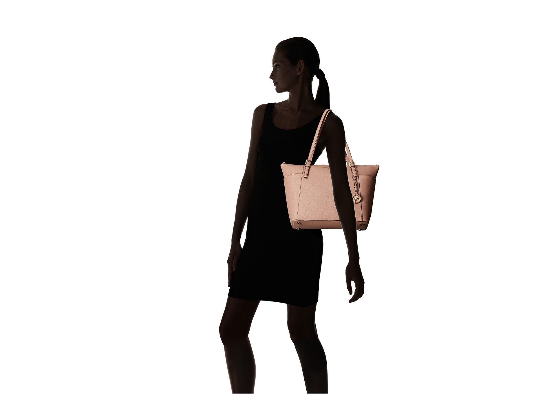 | Product Information SKU: #8902993A classic silhouette made for a sophisticated, modern woman: The MICHAEL Michael Kors? Jet Set Saffiano Top Zip Tote.Tote made of genuine leather.Buckled shoulder straps.Exterior slip pockets.Brand logo hardware.Protective metal-foot base.Top zip closure.Features a back-wall zip pocket, slip pocket and a keyfob. Signature print-lined interior. Imported. This product may have a manufacturer's warranty. Please visit the manufacturer's website or contact us at warranty@support.zappos.com for full manufacturer warranty details.Please note, the hardware color and interior lining may differ from the color shown in the photo.Measurements: Bottom Width: 12 1?4 in Depth: 4 3?4 in Height: 11 in Strap Length: 23 in Strap Drop: 9 1?2 in Weight: 2 lbs 0.5 oz |