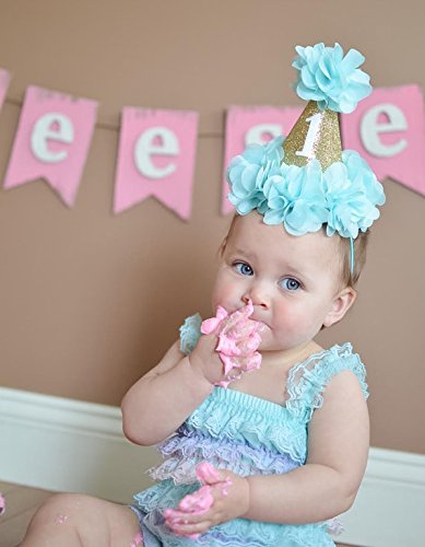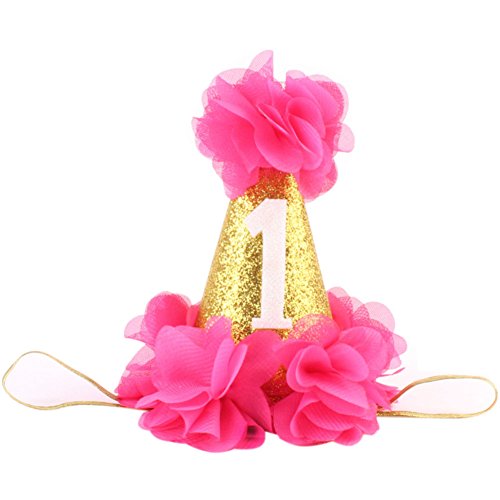 Product Description Dusty rose ruffle chiffon flowers on a gold sparkle cone and a sparkly birthday #, this hat is a show stopper for any posh birthday outfit! Hat is made on elastic just like traditional children's party hats. 0