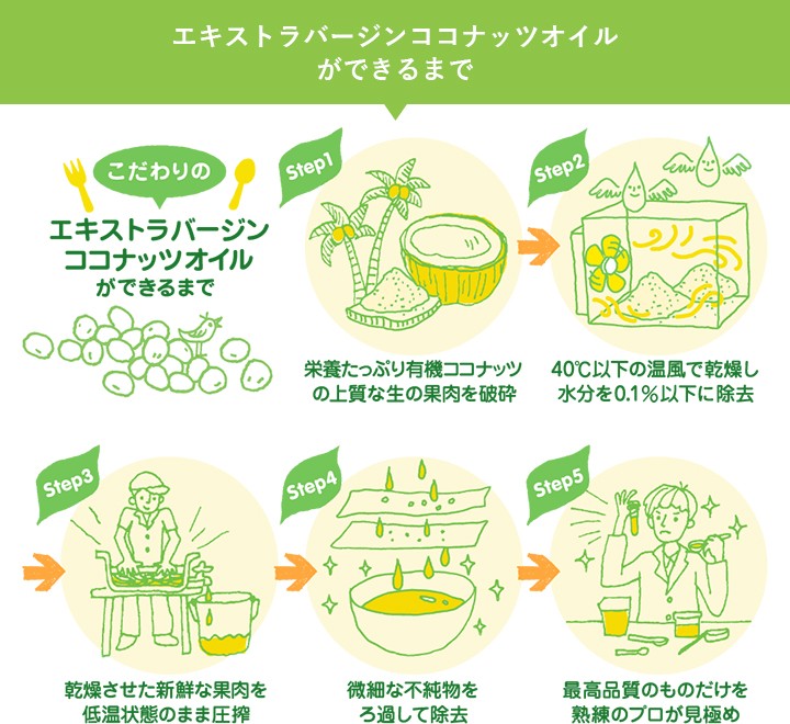 | 商品の説明 | 採りたての果肉を粉砕後、40度以下の温風で乾燥させ、水分を0.1%以下になるまで取り除いてから低温圧搾したエキストラバージンココナッツオイルです。中鎖脂肪酸を含んでいます。有機JAS認定食品。 |