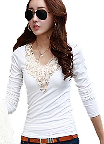 -. Title : (パラッツィー)PALAZZIE レディース カットソー 長袖 レースネック エレガント ゴールド 刺繍 ホワイト ブラック (L, ホワイト)