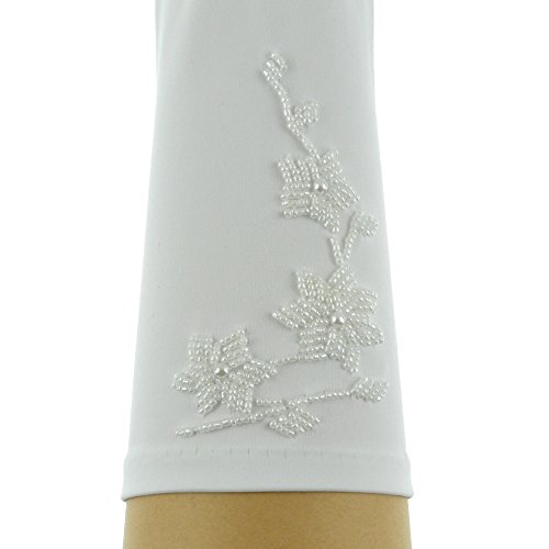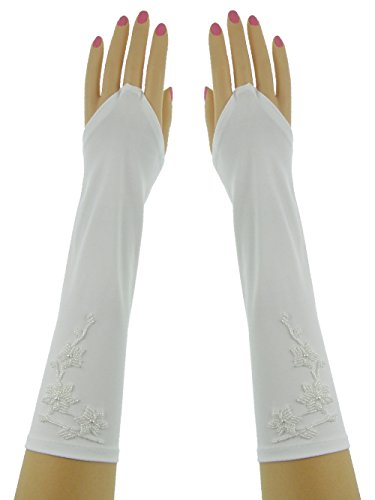Product DescriptionAbove Elbow Faux Pearl Embroidery Fingerless Stretchy Matt Satin Bridal Gloves0