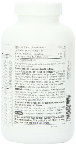 Dietary supplement. Glucosamine & MSM. Promotes joint health. Bio Align. Source Naturals Ultra Joint Response contains key amounts of MSM and glucosamine, along with potent antioxidants and nutrients, to provide a comprehensive formula for joint health. MSM, glucosamine and vitamin C help to lubricate and ease joint movement, while herbal extracts such as soothing support. (These statements have not been evaluated by the Food and Drug Administration. this product is not intended to diagnose, treat, cure or prevent any diseases.) Contains no yeast, dairy, egg, sugar, starch, salt, preservatives, or artificial color, flavor or fragrance.Feature