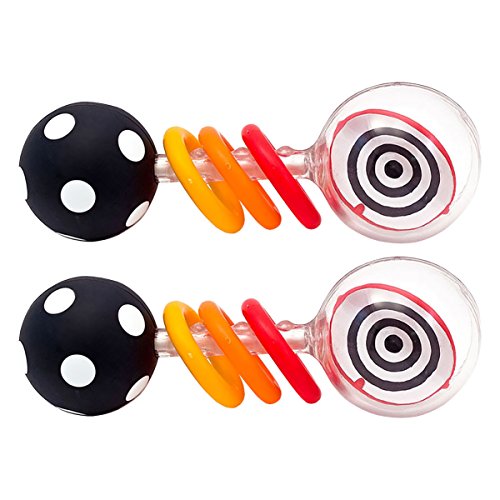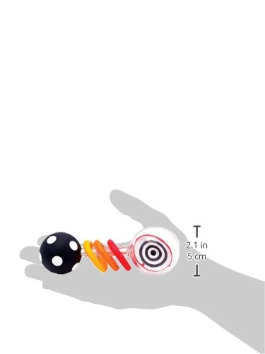 Sassy's Spin Shine Rattle inspires vision with its bold colors allowing baby to focus from birth. A reflective, rotating disc encourages eye tracking and simple textures for baby to explore and cultivate tactile sensitivity.Feature