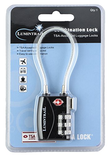 The Lumintrail 3 digit personalized combination cable TSA lock is the perfect solution for securing bags, zip pulls, suitcases, computer bags, and much more! The flexible cable allows for easy threading between zipper pulls or other small items you may want to lock together. With set-your-own combination convenience, you don't have to worry about losing the key while you travel. Also, the LKTSA719 comes in three colors--black, red, and silver--for easy baggage identification. TSA approved! No need to have unlocked baggage while traveling anymore. The red-and-white Travel Sentry mark on the lock notifies screeners that they can unlock and relock your baggage without having to break the lock open. Features: - Suggested uses: luggage, backpacks, bags, small cabinets, briefcases, computer bags, for indoor use only