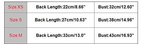 ? Size:XSBack Length:22cm/8.66"Bust:32cm/12.60" ? Size:SBack Length:27cm/10.63"Bust:38cm/14.96" ? Size:MBack Length:33cm/13.0"Bust:43cm/16.93"
