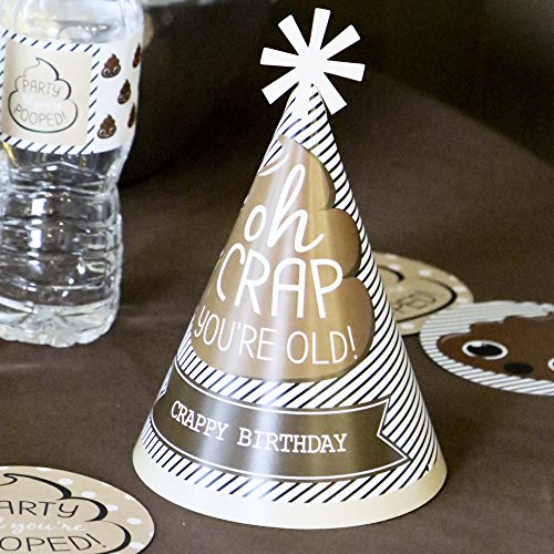 -. Feature : Oh Crap, You're Old! Birthday Party Hats INCLUDES 8 cone-shaped poop emoji Oh Crap, You're Old! Birthday party hats for adults with decorative top and elastic chin straps. Oh Crap, You're Old! Birthday party hats are a larger size but will fit both children and adults. / Oh Crap, You're Old! birthday party hats SIZE 8.5 inches tall and 5.5 inches in diameter at the base. The included elastic chin straps measure 12 inches long. Each of these fun poop emoji birthday party hats feature a unique star cut-out decoration at the top and P.R.Inted "Crappy Birthday" on the front. / FUN BIRTHDAY PARTY SUPPLIES: Oh Crap, You're Old! cone party hats are perfect for your poop emoji birthday party. This set of cute party hats will help you take memorable party photos. They are sure to be enjoyed by all your friends and family - and the guest of honor! / PREMIUM PARTY HATS: Set of 8 Oh Crap, You're Old! party hats are professionally P.R.Inted on heavy-duty cardstock paper with a photo-like shine. They are individually inspected, then carefully packaged. Oh Crap, You're Old! cone party hats will arrive flat, with the chin straps attached. Easy assembly is required. Simply roll the party hat into a cone shape and slide the tab into the slot to secure. / MADE IN THE USA: Oh Crap, You're Old! - Cone Birthday Party Hats are designed and manufactured at our Wisconsin facility using materials that are Made in the USA.