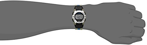 This digital unisex watch features a round gray matte case with green buttons. Its nylon strap is gray with a stylish blue strip in the middle. It also comes with a 100-hour chronograph to time your activities with lap and split feature. This watch also features a 99-lap counter, 24-hour countdown timer with option to stop or repeat at end. This watch also features three daily, weekday, weekend or weekly alarms with five-minute backup.