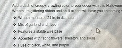 -. Feature : This wreath presents a collection of ghoulish skulls / Crafted of molded styrofoam and decorated with black tuille and glitter accents / Measures approximately: 16" Diameter x 3"D
