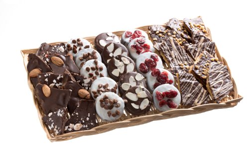 -. Feature : This beautiful, homey wicker tray contains a selection of 3 of our newest and most popular delectable gift treats, beautifully topped with a classy gold bow. / Chocolate Bark in 2 flavors - Roasted almond and peppermint. / Oreo-like cookies in 3 flavors. Black chocolate topped with white chocolate chips, White chocolate with craisins, and Black chocolate with coconut crunch / Chocolate Skids, a unique Barnetts creation, in 2 flavors. Almond crunch and caramel drizzle. / Handcrafted with care, freshly made from only premium and natural ingredients.