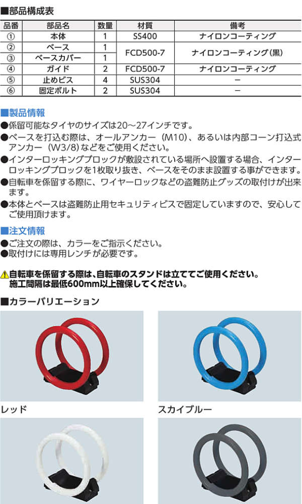 ●【注意事項】自転車を係留する際は、自転車のスタンドは立ててご使用下さい。施工間隔は最低600mm以上確保して下さい。
