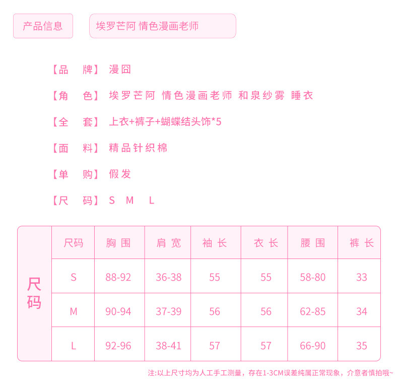 S: chest 88-92cm, shoulder 36-38cm, sleeve 55cm, shirt's length 55cm, waust 58-80cm, pants's length 33cm.