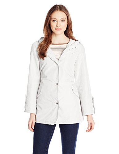 Anne Klein hooded logo snap front jacket. Raglan shoulder with sleeve tab detail.
