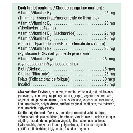 Safety Warning Consult a health care practitioner prior to use. Ingredients Vitamin B1 (Thiamine Mononitrate) 25 mg, Vitamin B2 (Riboflavin) 25 mg, Vitamin B3 (Niacinamide) 25 mg, Vitamin B5 (Calcium d-Pantothenate) 25 mg, Vitamin B6 (Pyridoxine HCl) 25 mg, Vitamin B12 (Cyanocobalamin) 25 mcg Folate (Folic Acid) 30 mcg, Biotin 25 mcg, Choline (Choline Bitartrate) 25 mg, Inositol 25 mg. Also contains: Dextrose, cellulose, mannitol, citric acid, natural flavours (strawberry, blueberry, raspberry, vanilla, grape), vegetable stearic acid, vegetable magnesium stearate, silica, sucralose, water-soluble cellulose, titanium dioxide, polydextrose, purified magnesium silicate, maltodextrin, medium chain triglycerides. NO gluten, lactose or artificial flavours. Directions Adults: Chew 1 to 2 tablets daily with a meal. Store between 15ºC and 25ºC away from children. Legal Disclaimer Actual product packaging and materials may contain more and different information than what is shown on our website. We recommend that you do not rely solely on the information presented and that you always read labels, warnings, and directions before using or consuming a product.Feature