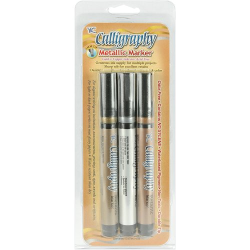 -. Feature : Metallic calligraphy markers calligraphy markers contain a generous ink supply for multiple projects / Sharp durable nibs for excellent results are odor free, contain no xylene, have water-based pigment and are non-toxic / For elegant writing on invitations, announcements, greeting cards, signs, awards and certificates on light or dark paper also writes on most glossy papers / Ink is water resistant when dry and conforms to ASTM D4236 / This package contains three markers with silver, gold and copper color