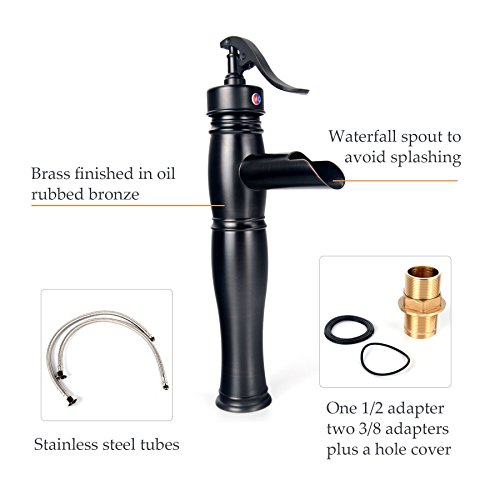 -. Feature : BEAUTIFUL & DURABLE, solid brass construction finished in oil rubbed bronze, showcases a stunning look, instantly transforms your space with this authentic vintage vessel faucet / NO LEAKING, redesigned and upgraded connection parts for the whole faucet for superior anti-leaking performance / EASY TO INSTALL, two complementary 3/8 in. adapters and faucet hole cover plate for easy installation / WARRANTY, premium quality backed by 1-year limited warranty, free exchange if the item is defective / NO SPLASHING, long waterfall spout reduces water velocity, prevents water from splashing to decrease water usage and save you money, perfect for traditional bathroom renovation projects with affordable P.R.Ice