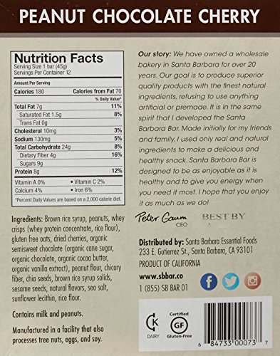-. Binding : Grocery -. Brand : Santa Barbara Bar -. Label : Santa Barbara Bar -. Manufacturer : Santa Barbara Bar -. MPN : 150965-55195 -. PackageQuantity : 12 -. PartNumber : 150965-55195 -. ProductGroup : Grocery -. ProductTypeName : GROCERY -. Publisher : Santa Barbara Bar -. Studio : Santa Barbara Bar -. Title : Santa Barbara Bar Peanut Chocolate Cherry - 1.58 oz - 12 Pack