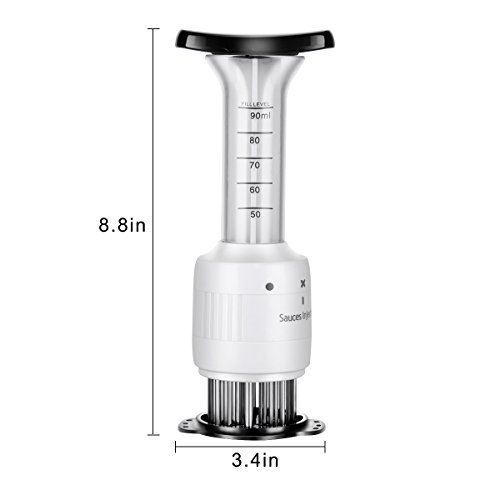 - ★DUAL FUNCTIONS: Tenderize and flavorize the same time,This Meat Injector allows you to safely tenderize and flavorize your meat at the same time. A built-in plunger releases marinade into meat via three needle-like applicators, quickly saturating the interior of food with flavor enhancing ingredients.