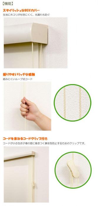 防炎生地を使っている為、燃えにくく、燃え広がらないロールスクリーンです。防炎ラベル付きなので事務所や店舗など、消防法で定められた場所でもお使いいただけます。ボックスタイプ・コードクリップ付きです。 |