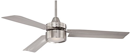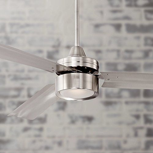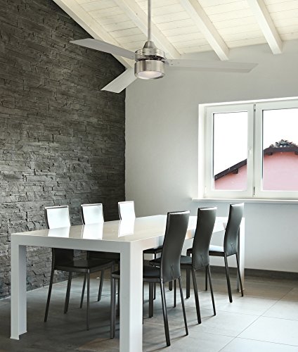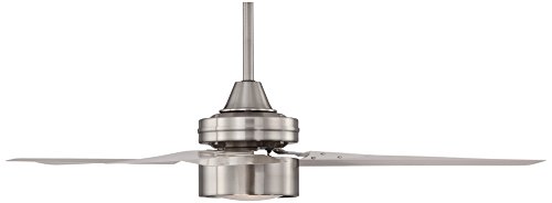 Contemporary appeal adds style to this ceiling fan from the Arcus™ Collection by Casa Vieja®. Finished in a sleek brushed nickel with three, thick brushed nickel finish metal blades and an energy efficient, frosted glass LED light. Includes a hand-held remote control. Blades must be mounted at least 10 feet from the floor.
