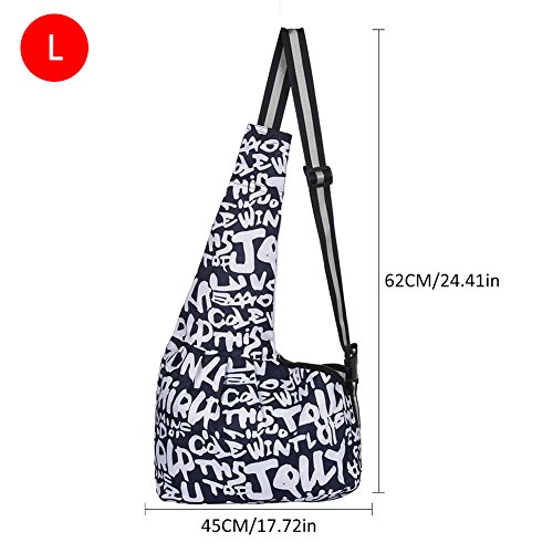 -. Feature : Size for reference(approx.):M: bag length: 58cm / 22.83in, bottom width: 16cm / 6.30in, bag width: 38cm / 14.96in, for pet of 2-3.5kg / 4.4-7.7lb; L: bag length: 62cm / 24.41in, bottom width: 18cm / 7.09in, bag width: 45cm / 17.72in, for pet of 3.5-5kg / 7.7-11lb; / Broaden shoulder strap design offers great comfort with adjustable length / The security hook design at the inner part to prevent pets from escaping / It is suitable for small cats and dogs to use for shopping malls, travel, shopping, riding and so on
