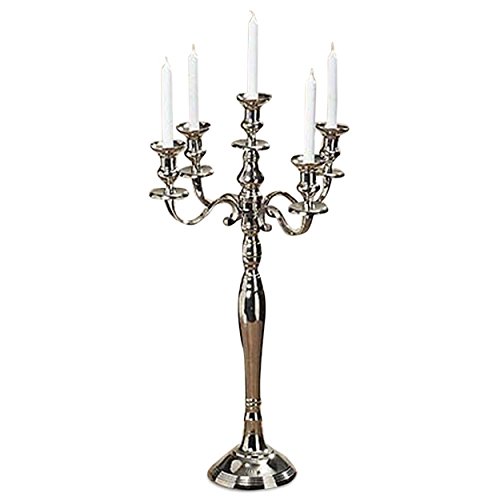 Studio : Whole House Worlds Publisher : Whole House Worlds Binding : Kitchen Product Description ADD SOPHISTICATED STYLE to your party with our stunning silver 5 Candle Candelabra. With 4 arms, extend the wonderful glow of a lighted candles to welcome your guests. OVER 2 1/2 FT TALL Well sized, this piece measures as follows: 18 L x 18 W x 30 ¾ H inches. Elevating candle light, this is the ideal candelabra to create an inspired atmosphere of welcoming warmth on your table top. SIMPLY ELEGANT Made to hold 5 taper candles that stretch out on extended arms decorated with curved lines, with a clever bobeche (or drip catcher plate) under each holder. Each candle holder is designed to hold a standard size taper candle. HIGH QUALITY CRAFTMANSHIP Loaded with ambience, this candelabra is hand crafted from silver aluminum nickel and carefully polished for a high luster finish. Each piece of the candelabra can be screwed apart for easy cleaning. There are remains of the artisans touch in the minor imperfections that are completely normal and to be expected. DELIGHT YOUR GUESTS when you add lighted candles to make any occasion feel magical. Enjoy! By Whole House Worlds Welcome to the product line of Whole House Worlds. The New York based company offers high quality, stylish products for every room in the house, and beyond. From the kitchen, to the living room, to the bedroom, dining room, home office, closet and garden: Our criteria are comfort, quality, style and value. 0