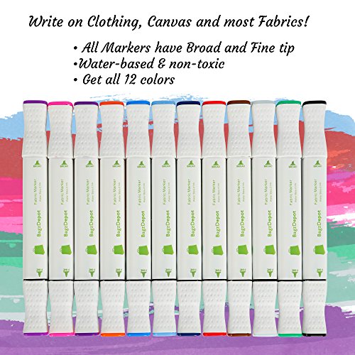 Permanent Fabric Markers Pack Of 12 - Water Based Textile Paint Pens - Safe, Non-Toxic Ink - Fine & Broad Tips - Fade Resistant, Machine Washable Vivid Colors - For Clothing, Shoes, Tote Bags & More