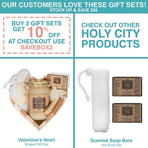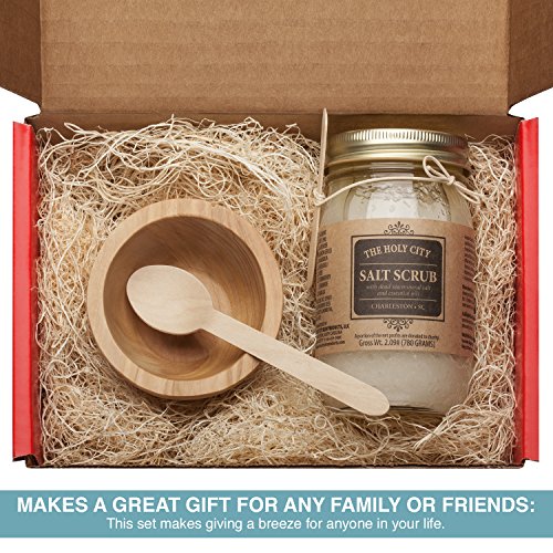 Gift Box Set containing a Dead Sea Salt Scrub, wooden bowl, and wooden spoon. Exfoliate and pamper your body with this Salt Scrub that combines Dead Sea Salt and minerals with natural, moisturizing Oils. Gentle and reviving, the scrub exfoliates the top layer of dead skin cells, revealing a younger layer of skin. While smoothing and stimulating the skin, this relaxing body scrub will gently buff away dead skin cells leaving your skin smooth, supple and refreshed. Scrubs help circulation and are a wonderful way to invigorate your skin. The abrasive action of the salt will remove dead skin cells and open pores, allowing them to breathe. A vigorous scrub not only softens, stimulates and cleans the skin but also makes it look lighter. The set includes the Dead Sea Scrub, wooden bowl for convenient use, and a wooden spoon.Feature