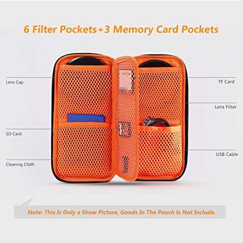 Exclusive Filter Pouch: Easy to carry, can be held on the waist by Velcro belt. Can filled with 6 pcs lens filters + 3 cards+1 cleaning pen. Filter Pocket Dimensions: 2.8’’*2.8'' Card Pocket Dimensions: 2’’*1.6''