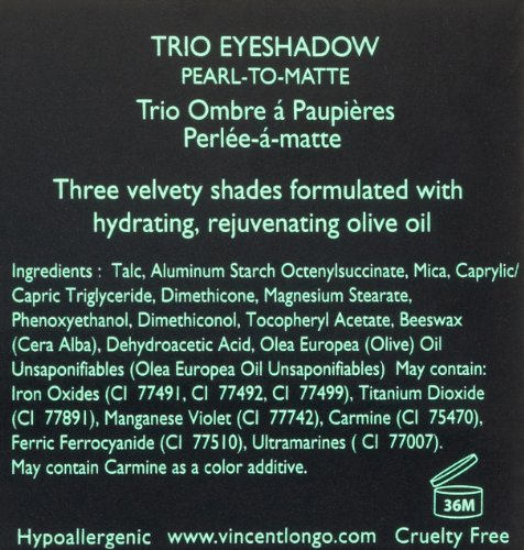-. Binding : Health and Beauty -. Brand : VINCENT LONGO -. Color : Untitled -. IsAdultProduct : 0 -. Label : VINCENT LONGO -. Manufacturer : VINCENT LONGO -. MPN : VP-10831 -. PartNumber : VP-10831 -. ProductGroup : Prestige Beauty -. ProductTypeName : LUXURY_BEAUTY -. Publisher : VINCENT LONGO -. ReleaseDate : 2015-02-01 -. Studio : VINCENT LONGO -. Title : VINCENT LONGO Pearl-To-Matte Trio Eyeshadow