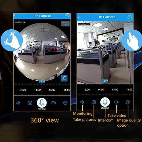 -. Feature : Smart Panoramic Camera: With the downloadable free App, Viewing via app is simple and breeze, you can control the camera at anywhere, 24 hours working even the light is off, each app can connect 5 camera, great for residential or business Surveillance / Motion Detection: With built-in high accuracy motion detection technology, the camera sends notifications to your smartphone alerting when, where, and what movement was detected, so you always stay on top of things that matter / 360 Degree Lens & 960P HD Resolution: Equiped with 165 degree wide 'fish-eye' lens, gives it good coverage of the entire room,with the advanced H.264 technology, the recorded picture quality Is very sharp and clear from day time to night time, you can take a snapshot or video at any time with your mobile phone, also you can set the resolution from HD SD or Adaptive / Easy to Operate: The set up on this camera is beyond simple, plug it in, download the app, pair with your Wi-Fi and set up your account and it begins performing flawlessly. it may be the easiest IP camera you've ever linked / Super Two Way Talk: The built-in ultra-responsive microphone&speaker allows you to have smooth stable conversations through the mobile app, wherever you are. Intercom mode lets you activate the microphone and speaker, so you can send commands to your pet, or scare off unwanted guests