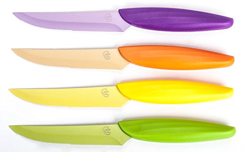 STRIKING, MODERN COLOR VARIETY: Impress your guests with these amazing kitchen knives! They come in a variety of different, modern, eye-catching colors including purple, orange, yellow, green, dark and light blue!