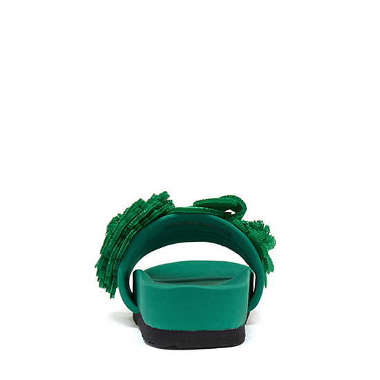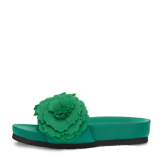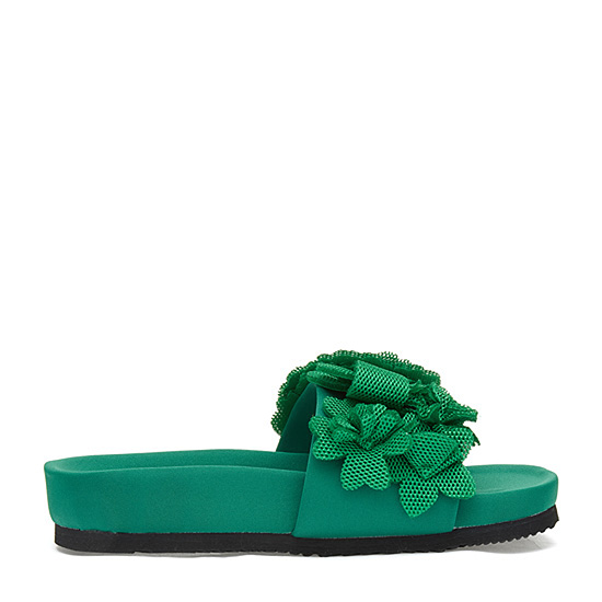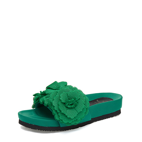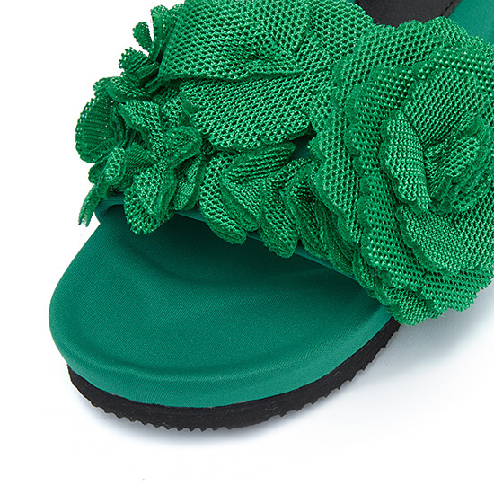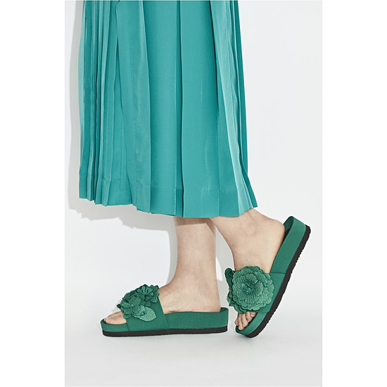 - 볼드한 플라워 코사지 장식으로 로맨틱한 무드의 샌들.