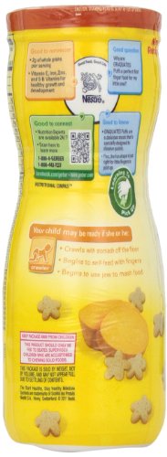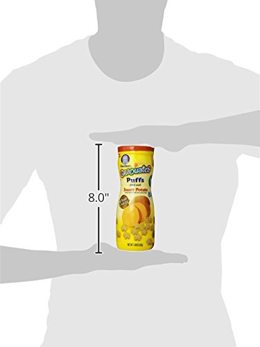 Puffed Grains with Real Sweet Potato. For babies learning to self-feed. Good source of Iron & Zinc. Melts in baby's mouth. Is your baby ready? See back panel for Readiness Cues. Your baby is ready for Veggie Puffs when he: Crawls on hands and knees (with tummy up and off the floor); Eats thicker, lumpier foods with larger pieces; Uses jaws to mash foods with gums; Holds small foods between thumb and first finger. Perfect first finger food. Unique, fun shape that's just right for babies to pick up. Made with real sweet potatoes. Light and airy texture dissolves easily. Portable package great for at home and on the go. Good source of iron and zinc. Veggie Puffs are part of the Gerber Finger Foods line of wholesome snacks, designed to teach your baby to feed himself. For Your Information: Gerber Veggie Puffs should only be fed to children who are accustomed to chewing solid foods. As with all food, Gerber recommends this product be served to a small child who is seated. Small children should always be supervised while eating. Naturally flavored with other natural flavors. This package is sold by weight, not by volume and may not appear full due to settling of contents.
