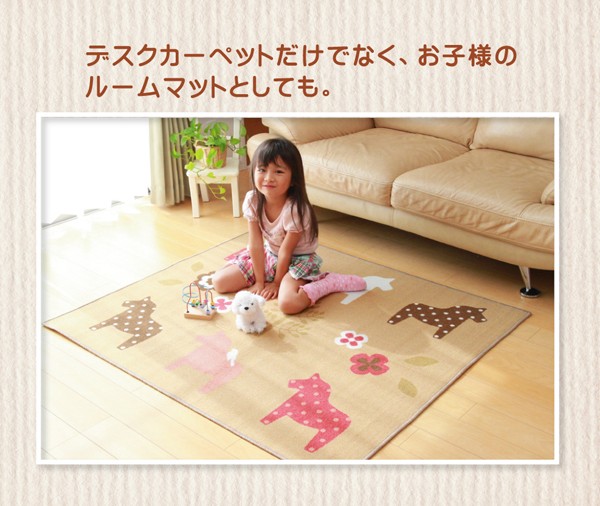 学習机用のデスクカーペットです。かわいらしいポニー柄が特徴です。表地は丈夫なナイロンをループタイプになっており、毛足が短く掃除がしやすい仕様になっています。裏地には不織布を使用していますので、フローリングが傷つきにくいです。お子様の学習机の下や、ベッドサイドなどにお勧めの商品です。