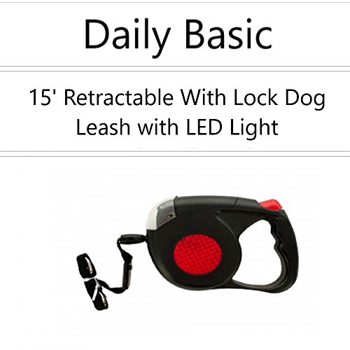 Studio : Daily Basic Publisher : Daily Basic Binding : Misc. Product Description Safely light the way with this easy to use Retractable Dog Leash with LED Light featuring an approximately 15' retractable leash for dogs up to 50 pounds and 4 bright, forward facing LED lights operated with an on/off switch. Leash locks in place or allows in and out movement. Requires 2 'AA' batteries (not included). Comes packaged in a clam shell. 0