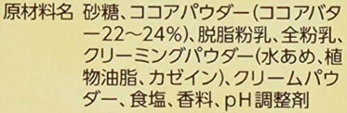 원재료:설탕,코코아 파우더(코코아 버터22~24%)고, 탈지분유,전분유,크리밍 파우더(물엿,식물성 기름지,(Kasein)카세인)고, 크림 파우더,식염,향료,pH조정 제
