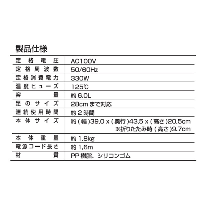 | 商品説明 | 全国送料無料!(沖縄、離島は出荷不可となります) 折りたたんでコンパクトに収納できるフットバスです。2トーンカラーの可愛いデザイン!保温機能付きだからお湯が冷めない!バブル機能でほっこりリラックスできます。保温カバーは収納時の持ち運びに便利な持ち手になっております。 サイズ・容量 本体サイズ ・使用時:39.0x奥行43.5x高さ20.5cm ・折りたたみ時:39.0x奥行43.5x高さ9.7cm 容量:約 6.0L 足のサイズ:28cmまで対応 ■素材・成分:PP樹脂、シリコンゴム ■パッケージ: 注意事項 製品仕様:画像をご参照ください |
