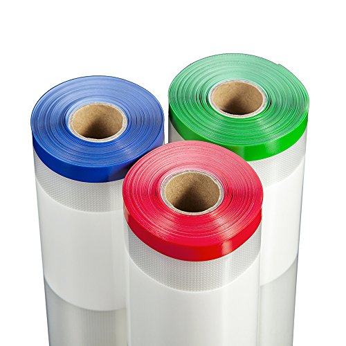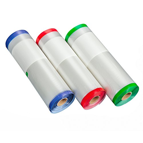 - Economic and Safe: 3 rolls in one pack. At a reasonable price, you will get 96 feet resealable and reusable vacuum sealer bags in red, blue and green colors. 8 inch wide and not pre-cut design so they can be cut to the any size you want: mini, small, medium, or jumbo.
