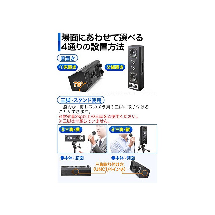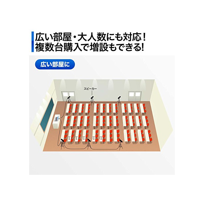 부속품으로 다이나믹 마이크를 1개 동봉 회의나 강의용 스피커로 해 곧 쓸만합니다.스피커는 최대26W의 고출력입니다.옥내 환경에 약120~150㎡정도 에서의 사용에 최적(※어디까지나 기준입니다.환경 등으로 다릅니다)본 제품은 출력 오버,howling에 의한 스피커 유닛의 파손을 방지하기 위해,자동적으로 일시 전원을 OFF로 하는 안전 기능을 탑재.