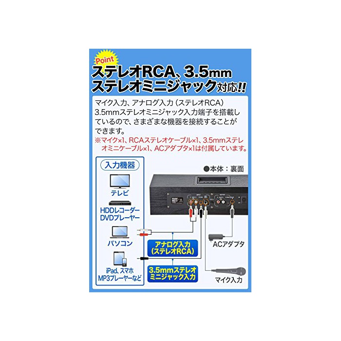 일체형 스피커 (이므로)그래서 전원,마이크를 접속 하는 것만으로 사용으로 옵니다.외부 음성 입력을 탑재하고, 음악 재생도 가능.동시에 마이크 음성 출력도 가능.카라오케 스피커로서 이용하거나,이벤트 등에서BGM과 함께 공지를 퍼뜨릴 수도 있습니다.음성 입력은 RCA(적흰색)Connector에,TV와의 접속도 최적입니다.