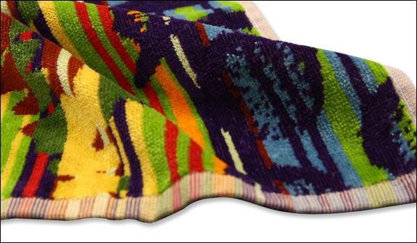 | 個性あふれる派手な柄がポイント!!確かなボリューム感が高級タオルの貫禄を醸し出しています。個性的な柄が生活を華やかに彩ってくれるはず! シャーリングといって、パイルの先端をカットする加工がされてあるので、糸の撚りがほどけて肌触りが通常のパイルよりも柔らかくなっています。 |