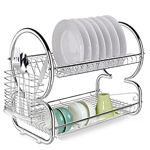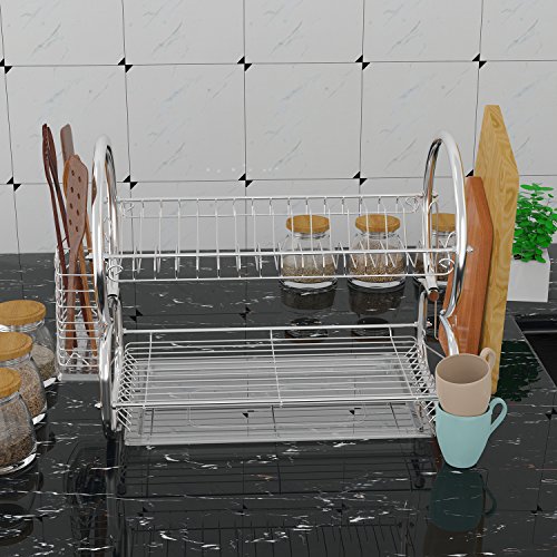 Product Description 1. Easy to assemble. 2. Non-marring silicone coated feet protectors 3. 2 tier Dish Rack, Less Counter Space. 4. Removable Side mounting mug stand and cutlery holder 5. It is suitable to place dishes, prefect to arrange glasses And other small utensils 6. It's fashion creative, and is a very useful accessory to tidy your Kitchen Features Material: Chrome Stainless Steel Color: Silver Item: Dish Rack Type: Storage Holders Rack Design: Drying Rack Style: 2 Tier Rack Holder Size: 44 x 25 x 38cm/ 17.2 x 9.8 x 14.8 inch( LxWxH) Suit for: Dish, Cup, Tray, Cutlery, Plate Occasion: Kitchen Notes Package Content: 1 x Dish Rack 1 x Plastic Draining Tray 1 x Mug Stand 1 x Cutlery Holder 0
